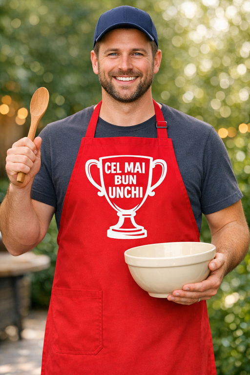 Șorțul roșu cu trofeu și textul CEL MAI BUN UNCHI e declarația perfectă pentru regele tigăii și al grătarului — se vede din prima cine adună toate „cupe-le” culinare.