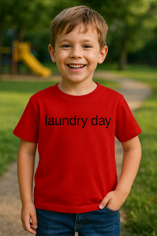🧺 ‘laundry day’ a sosit — iar acest tricou roșu îi adaugă micuțului programul EXTRA RÂS! 😄 Tricoul roșu cu imprimeu negru anunță clar că azi se învârte tamburul și buna dispoziție.