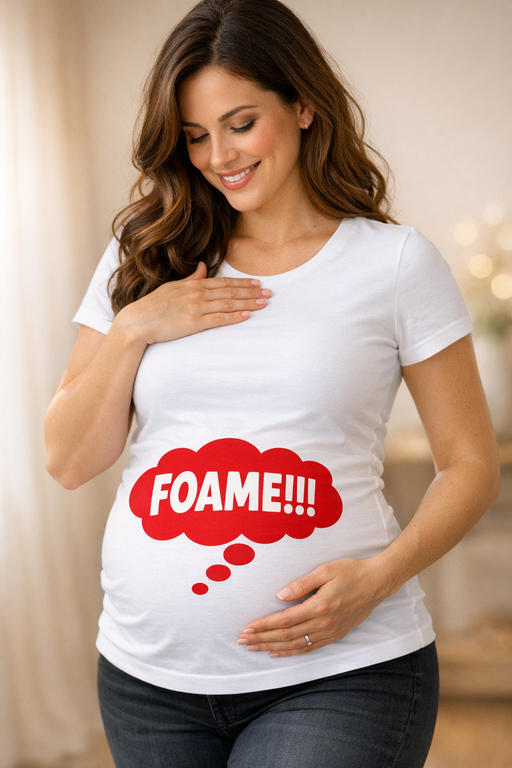 Tricoul pentru gravide „FOAME!!!” spune pe față ce simte burtica ta: e timpul de ceva bun. Designul cu norișor roșu atrage priviri și stârnește zâmbete, iar tu îți porți pofta cu umor și stil.