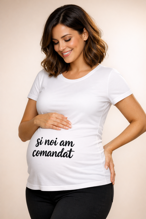 Un mesaj simpatic și ușor de înțeles pentru toți: „și noi am comandat” – adică bebe e în drum spre voi. Croiala pentru gravide îmbracă frumos burtica și arată grozav în poze.