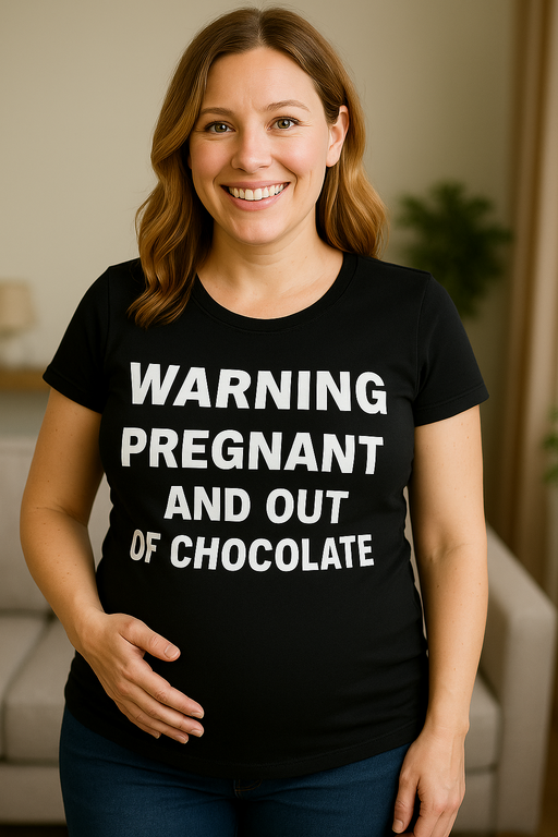 🚨 Alarm de ciocolată! Acest tricou pentru gravide cu mesajul WARNING PREGNANT AND OUT OF CHOCOLATE spune totul înainte să apuci să explici.